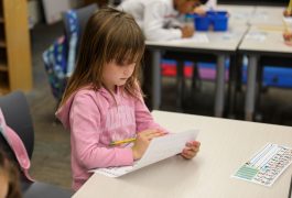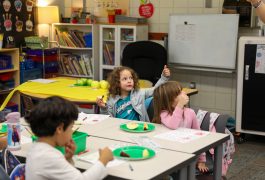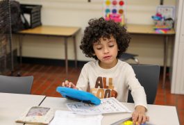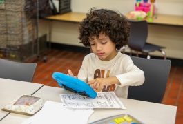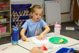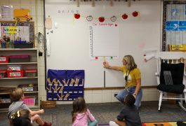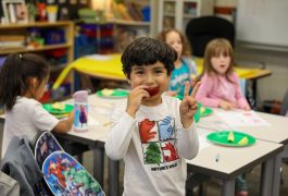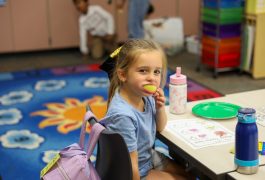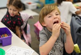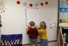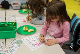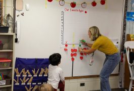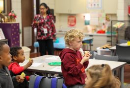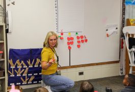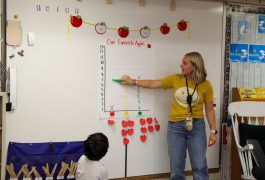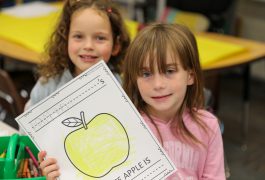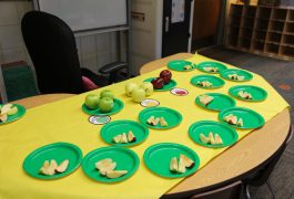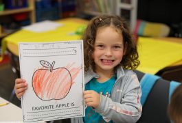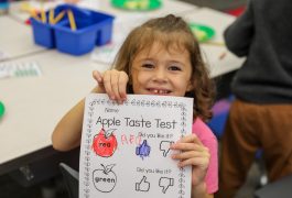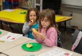As part of their lesson on the five senses, students participated in an apple tasting activity, sampling three different types of apples: yellow, green, and red. Together, the class discussed how each of their senses — sight, smell, touch, taste, and hearing — helps them learn more about the world around them.